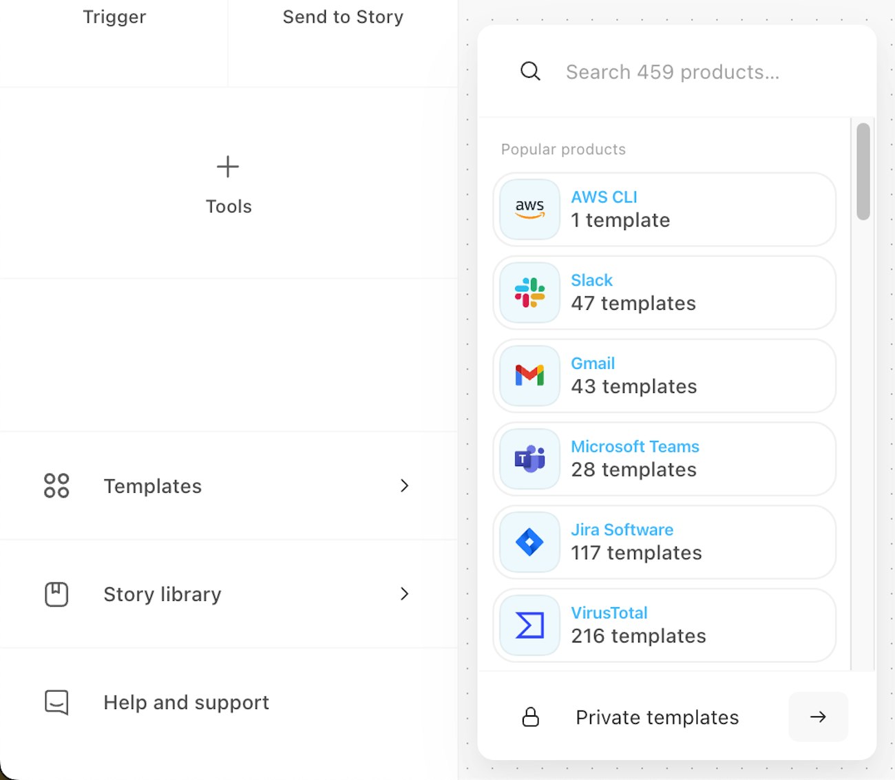 If you have a private API that you use internally, or if you have custom fields and configurations for your own tools (like Jira, Splunk, AWS etc.) you can create your own private templates within Tines. These templates are visible to everyone on the tenant.