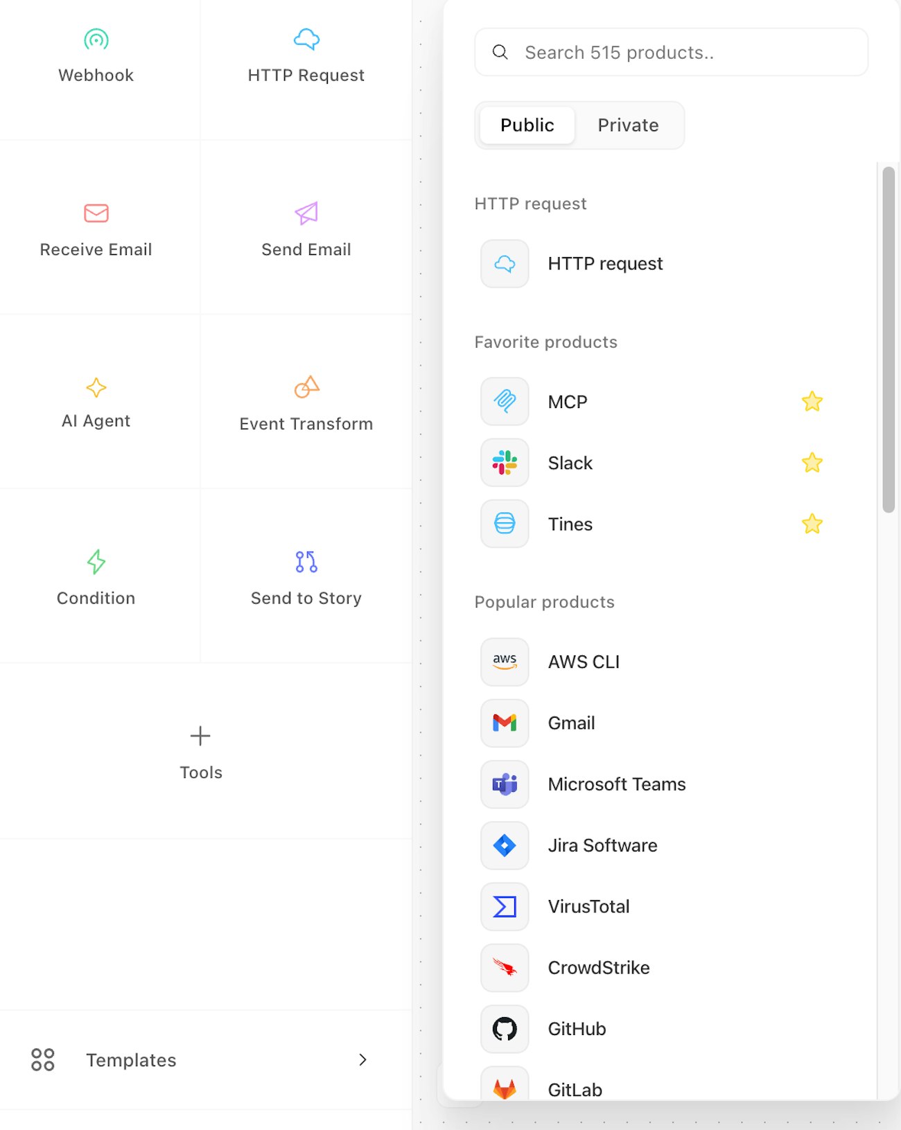 If you have a private API that you use internally, or if you have custom fields and configurations for your own tools (like Jira, Splunk, AWS etc.) you can create your own private templates within Tines.