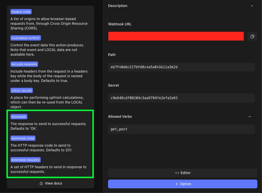 }Receive POST requests and respond with a custom response, response_code and response_headers. Response values and headers can be added by selecting them from the options dropdown.