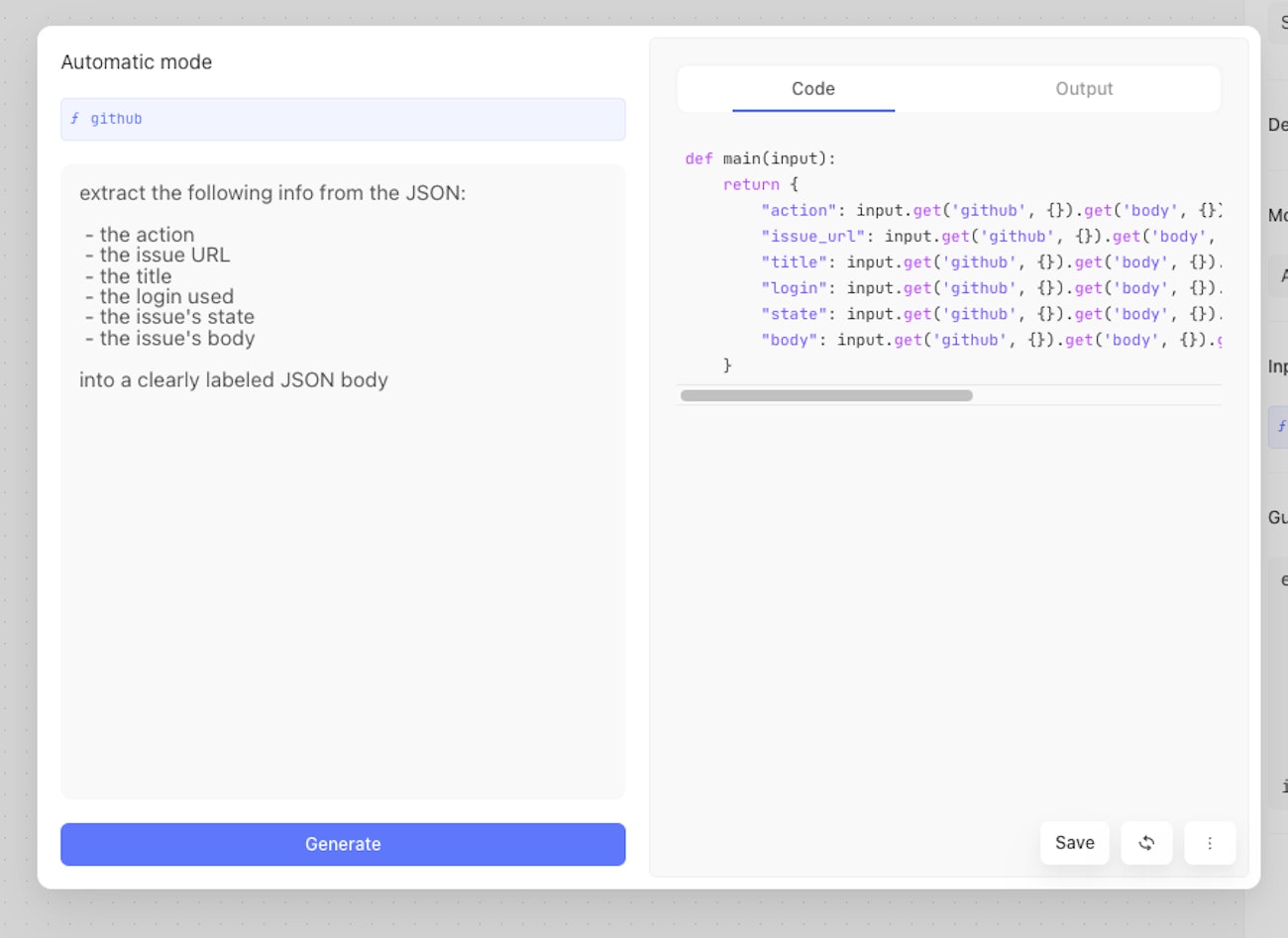 Under the hood, this feature uses build-time AI to compose Python code based on the guidance and the input you provide. Once you save your changes, the code is locked in place. This means that when the action runs, only the code executes, and no AI is involved.