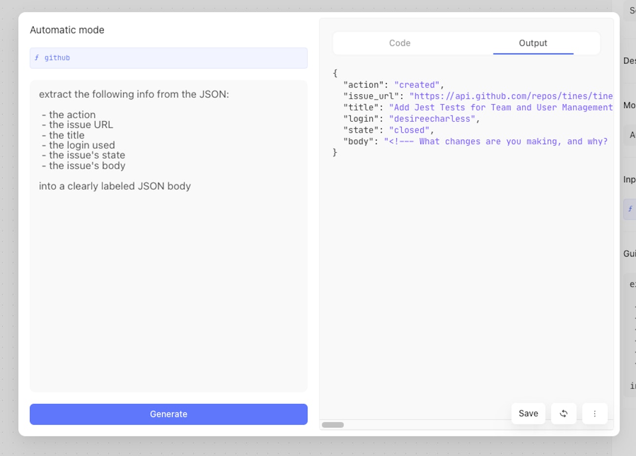 You can modify the prompt or the input and regenerate the script as many times as you want. When you're certain that the script will handle all of your use cases, you can click Save to lock the generated script in place. Any subsequent events that are passed into the automatic Event Transform Action will be transformed by this script.