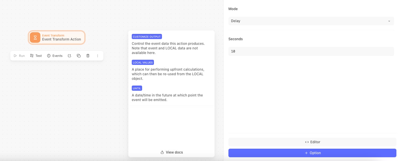 The Event Transformation Action delay mode pauses the story execution for specific number of seconds before emitting an event.