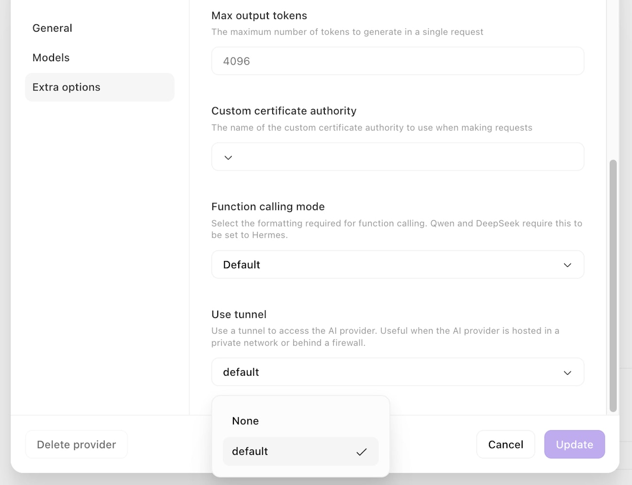 You can also configure a custom AI provider to connect via a Tines Tunnel. This can be configured under Extra options when configuring your provider. Connecting via a Tunnel allows your cloud tenant to securely access AI services running in your internal networks. Only Tunnels which are accessible by all teams can be used.