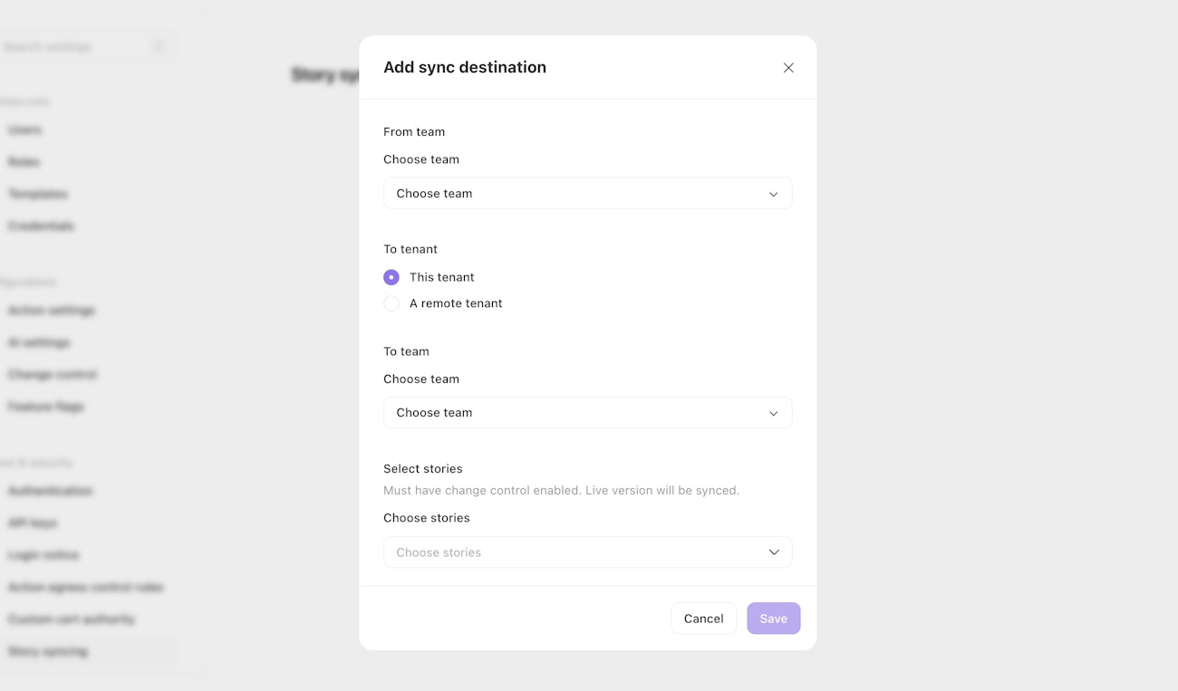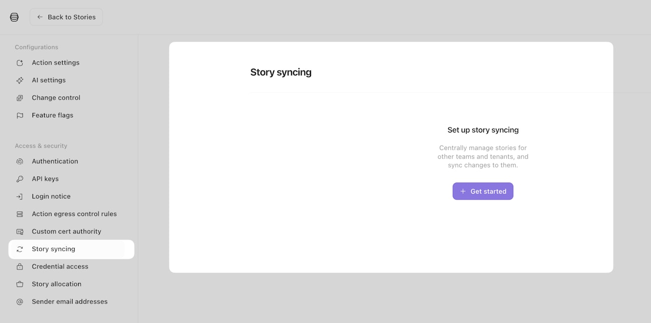 Story syncing can only be managed by tenant owners. The management UI can be found in the main settings sidebar, as ‘Story syncing’, within the ‘Access & security’ sidebar section.