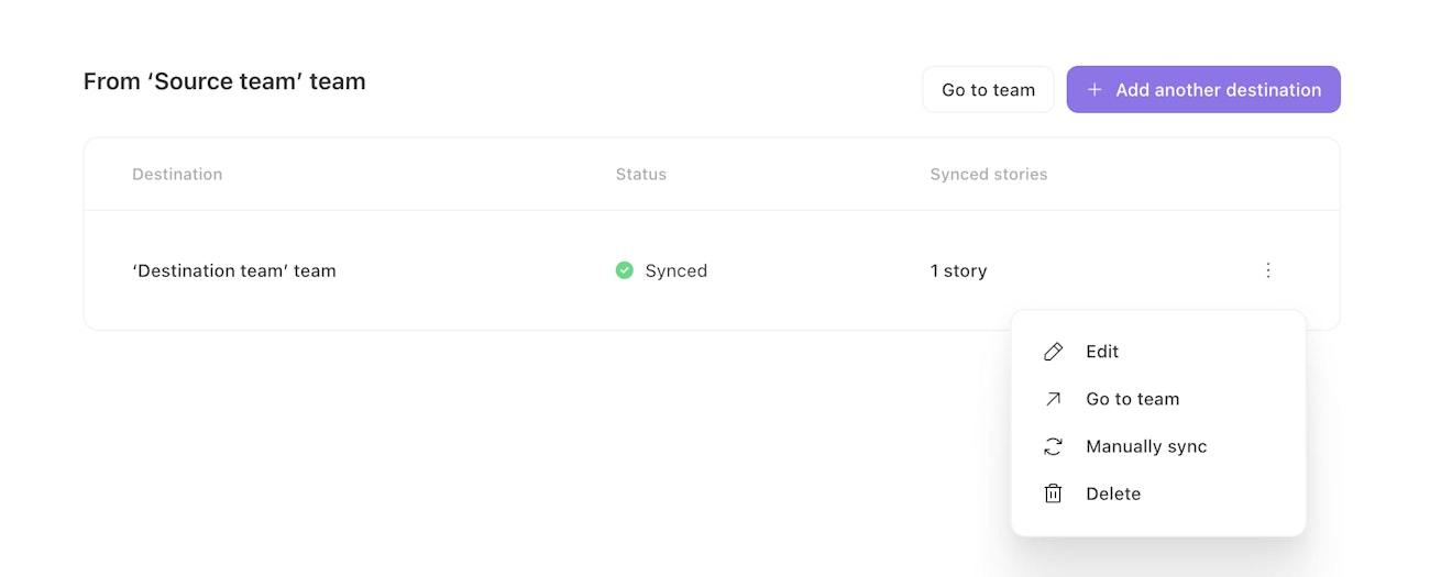 To achieve this, head to the story in the destination team. Then, in the story context menu in the top right (⋮), choose ‘Detach from sync’.