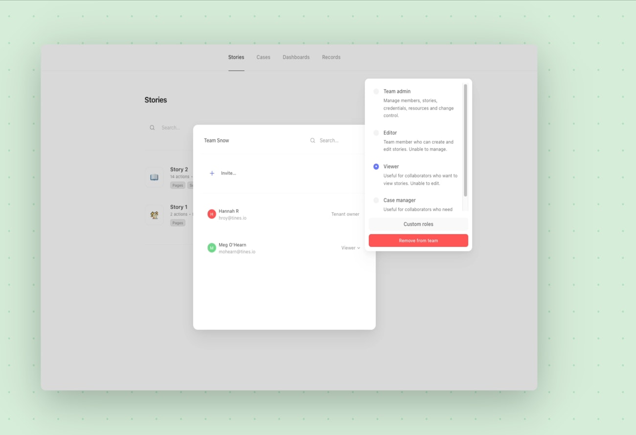 All members of a team or group must be assigned a role in Tines, e.g., Team Admin, Editor or Viewer. Each role has a set of permissions assigned to them which will give read and or write access to objects in the team or group.