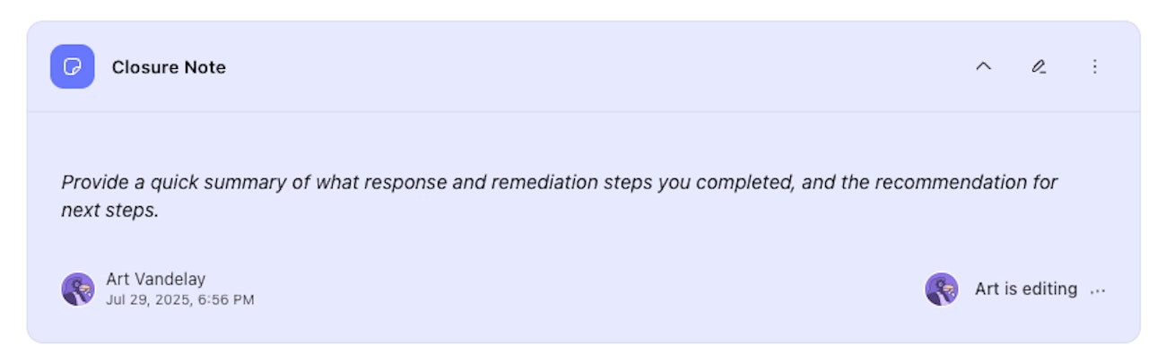 Real-time collaborative editing supports faster triage and review sessions within Cases — multiple editors can contribute to the same case description or note without overwriting each other's work.