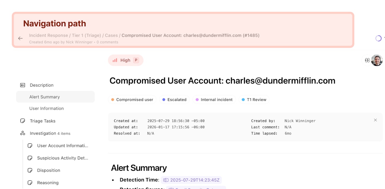 Team > Case group > "Cases" > Case name & IDThe navigation path also displays a hint with a few key details about the case, specifically: