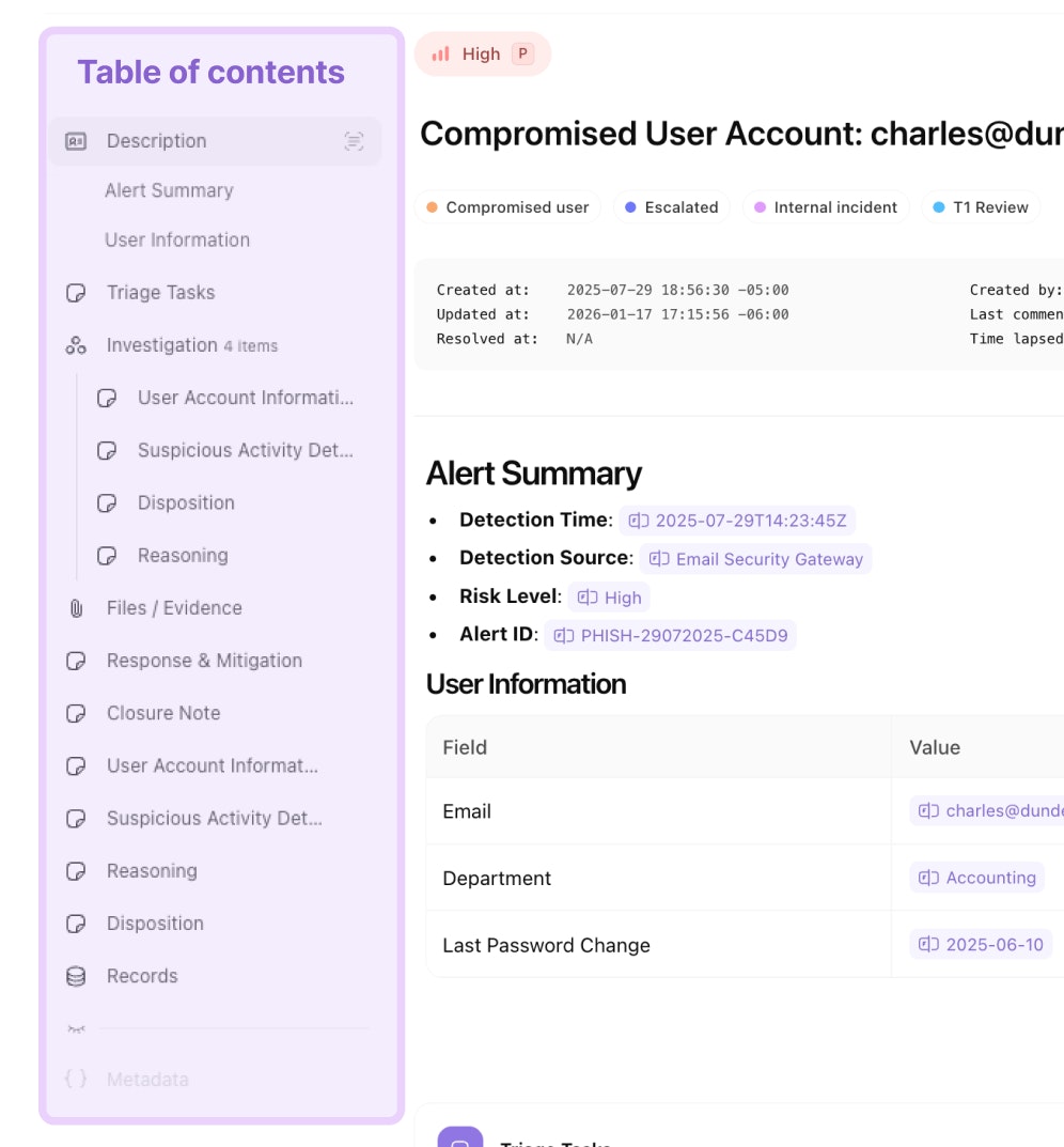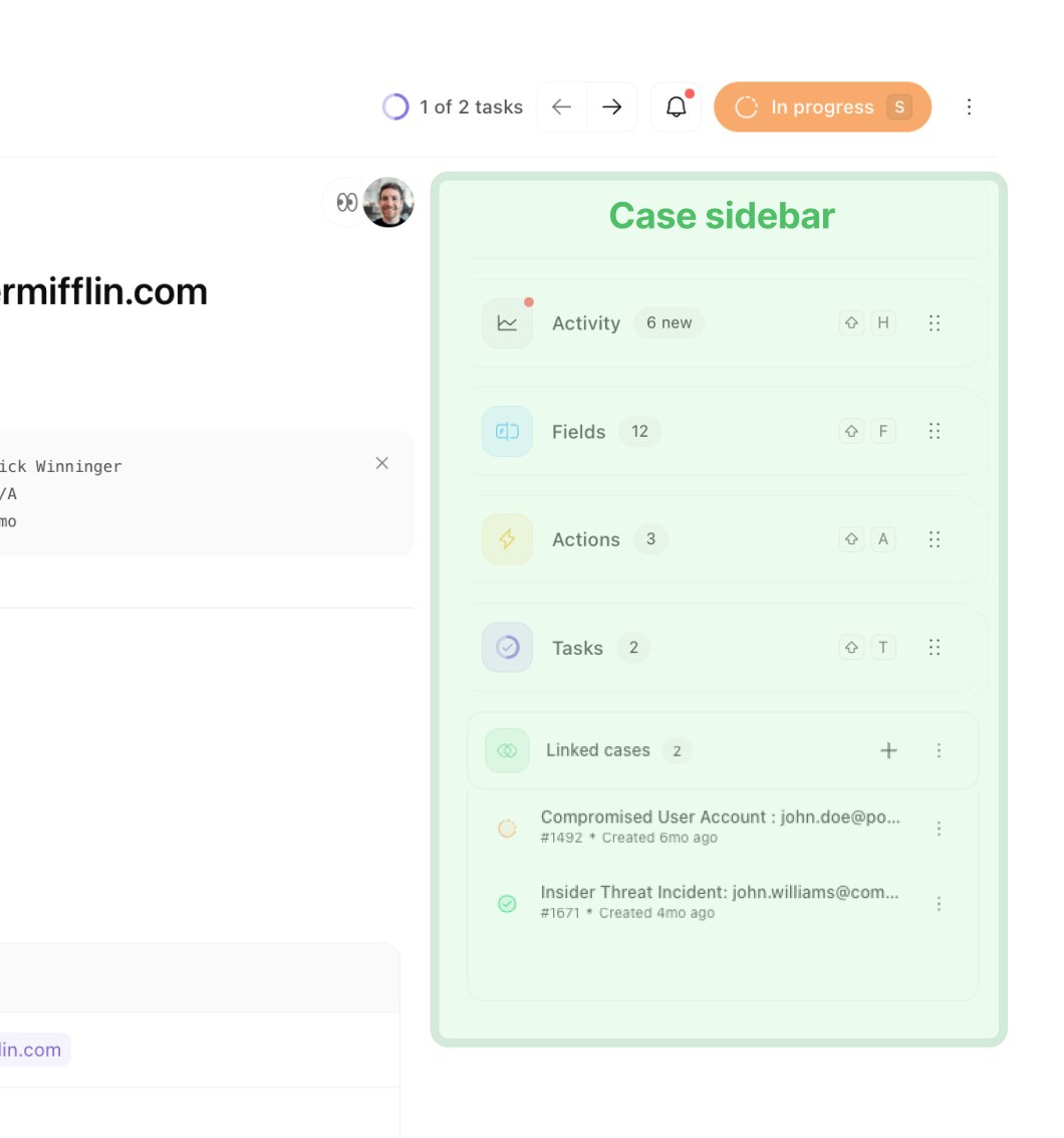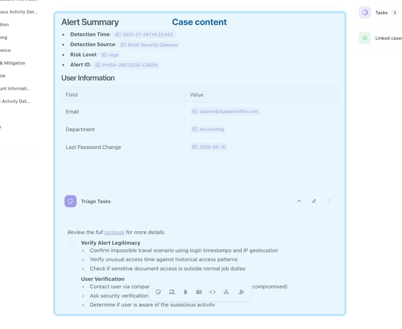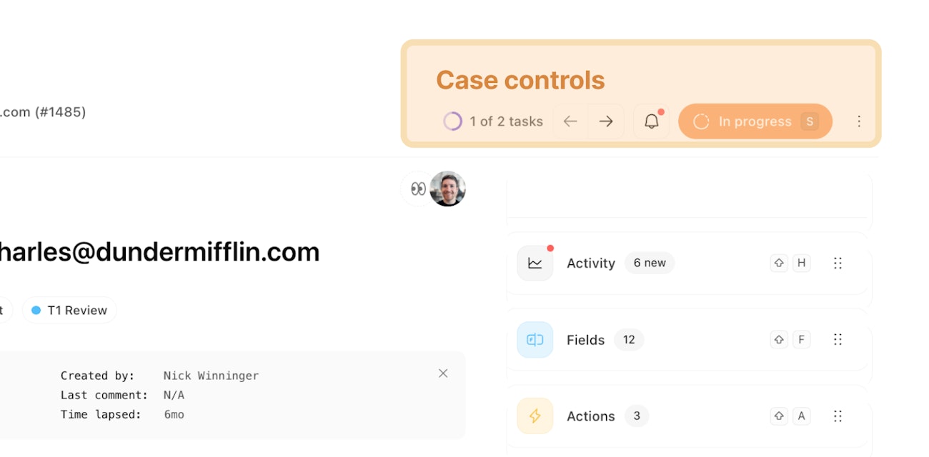 The sidebar keeps essential tools and context within reach while you work. Customize it to fit your workflow by reordering sections and chosing which case tools are displayed.