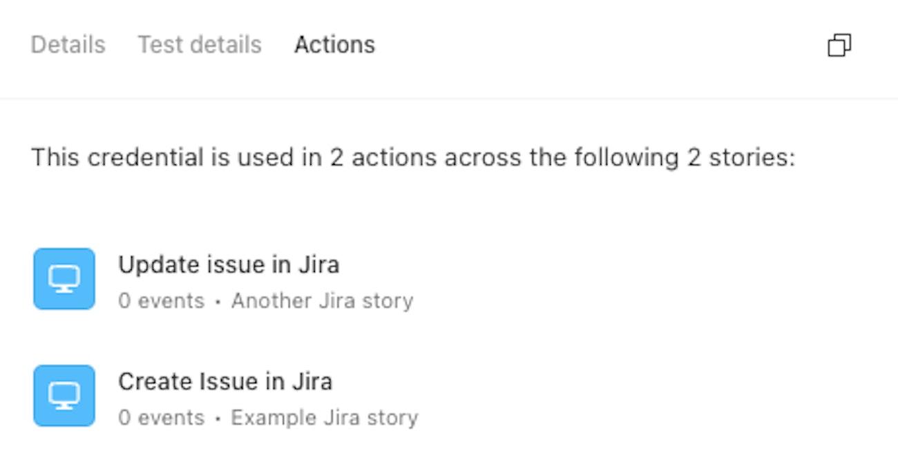 See where credentials are used Select the Actions tab to view a list of actions across your tenant using the credential. You can further select any action to view the story in more detail.