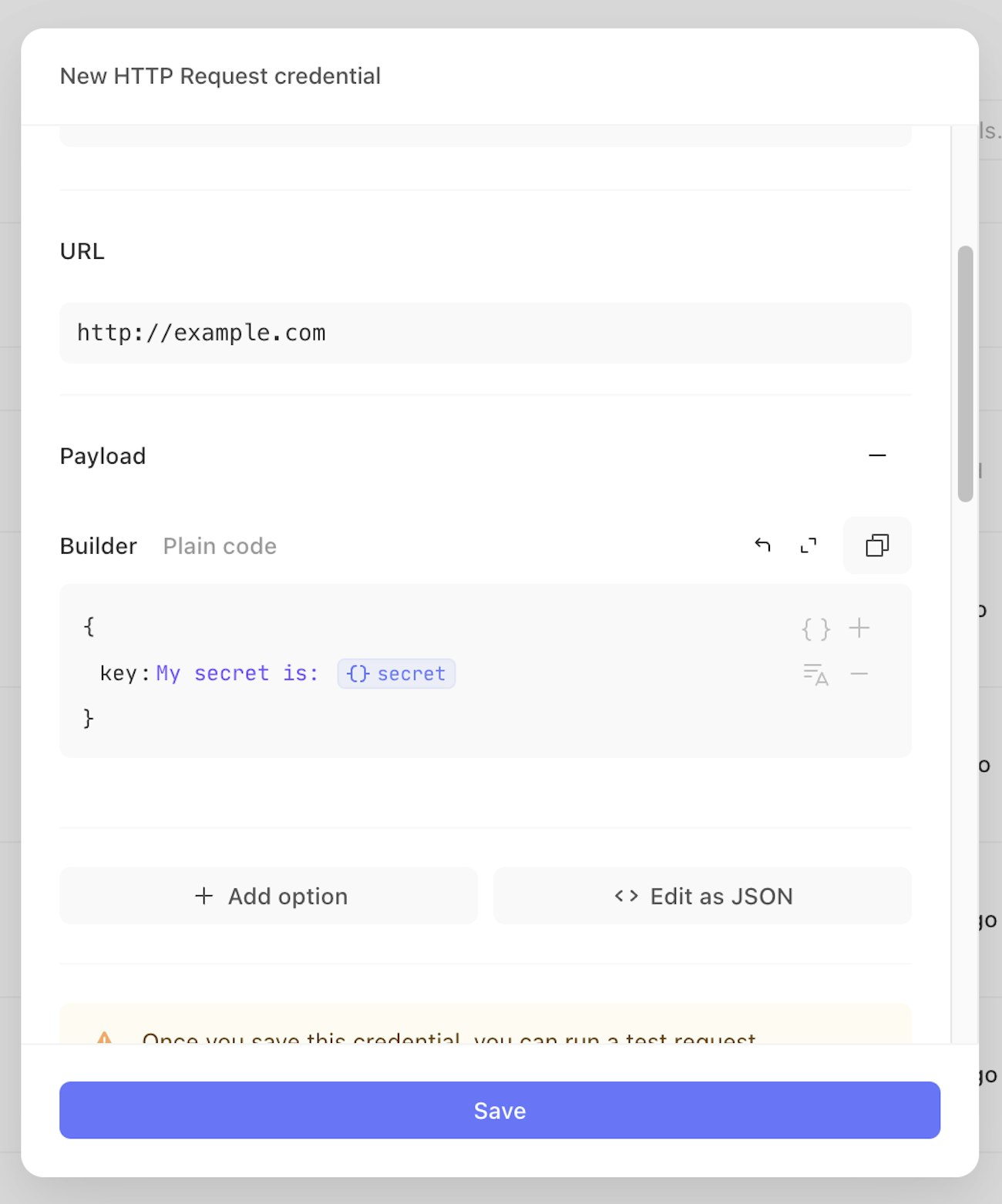 Additionally, you can input a secret value for use in the request. This is securely stored, and can be referred to in formulas within the request fields (params, headers, etc) as secret.