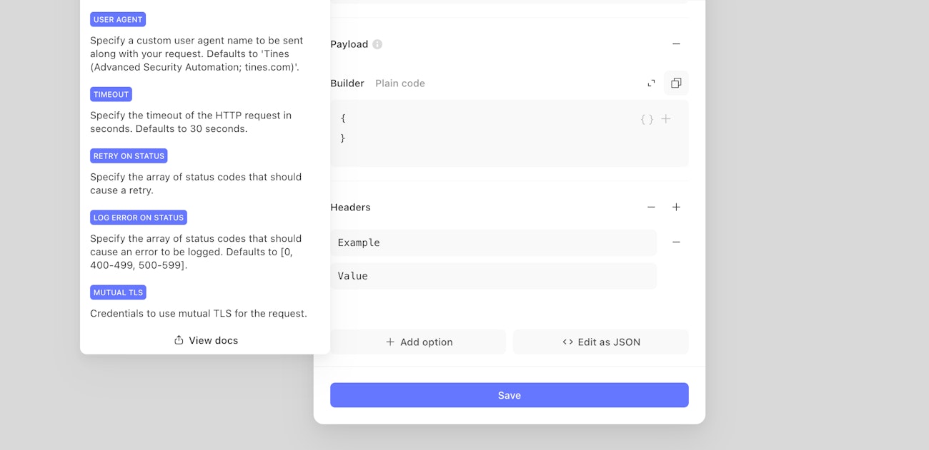 You’ll need to enter the URL, content type, method, and payload for the request you want to make to fetch your credential value. Beyond these basics, you can add any other request option that our HTTP request action supports.
