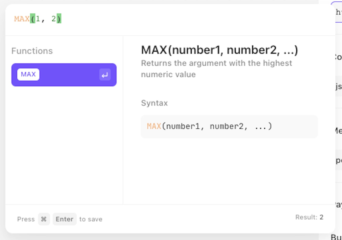 Use the popup formula builder to author your formula expression. We’ll show in-line help and documentation as you type, and a preview of the result.