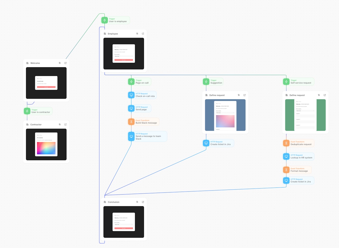 By connecting an arbitrary number of pages and actions, it's possible to build complex flows, and even self-contained applications, right here in Tines.