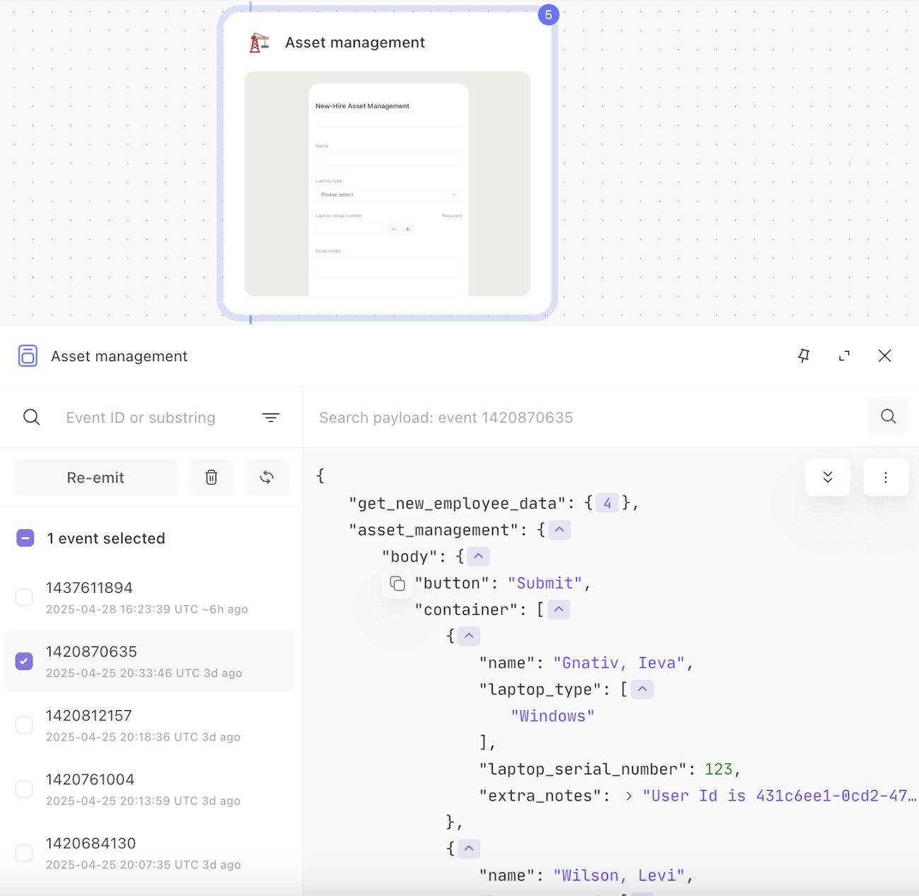 Based on your looping container's name, Tines groups the loop values in the page event's JSON output body as an array. For example, if your looping container is named "Container", it will appear as "container" (lowercased and snaked cased) in the event output payload.