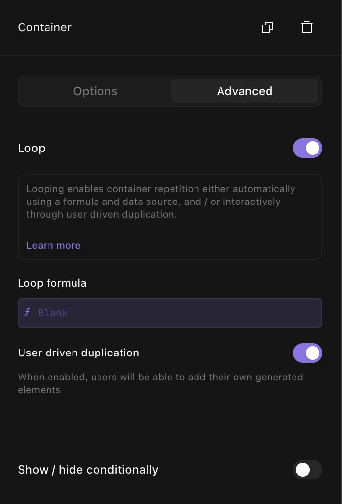 There is also an option to enable User driven duplication, which allows users to continue adding looped elements to a container.