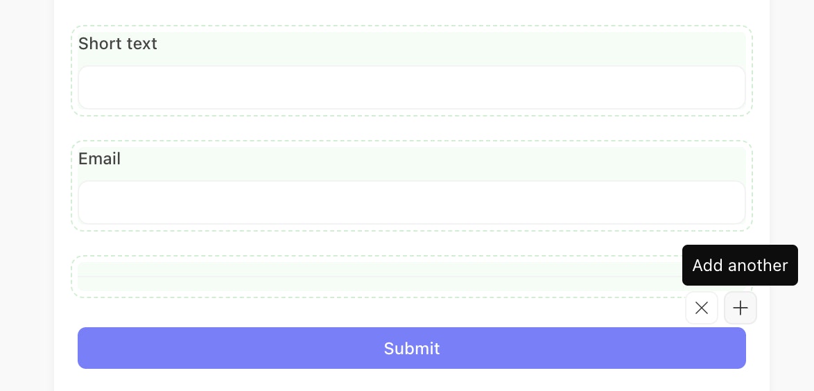 At the end of a looping container, after all the Loop Formula elements have been rendered, there will be a + Button at the bottom right of the last element. Clicking on this plus button will duplicate and add elements from the original container onto the screen. Similarly, once elements have been manually added, an x Button to delete elements will be rendered. Clicking on this button will remove any added elements.
