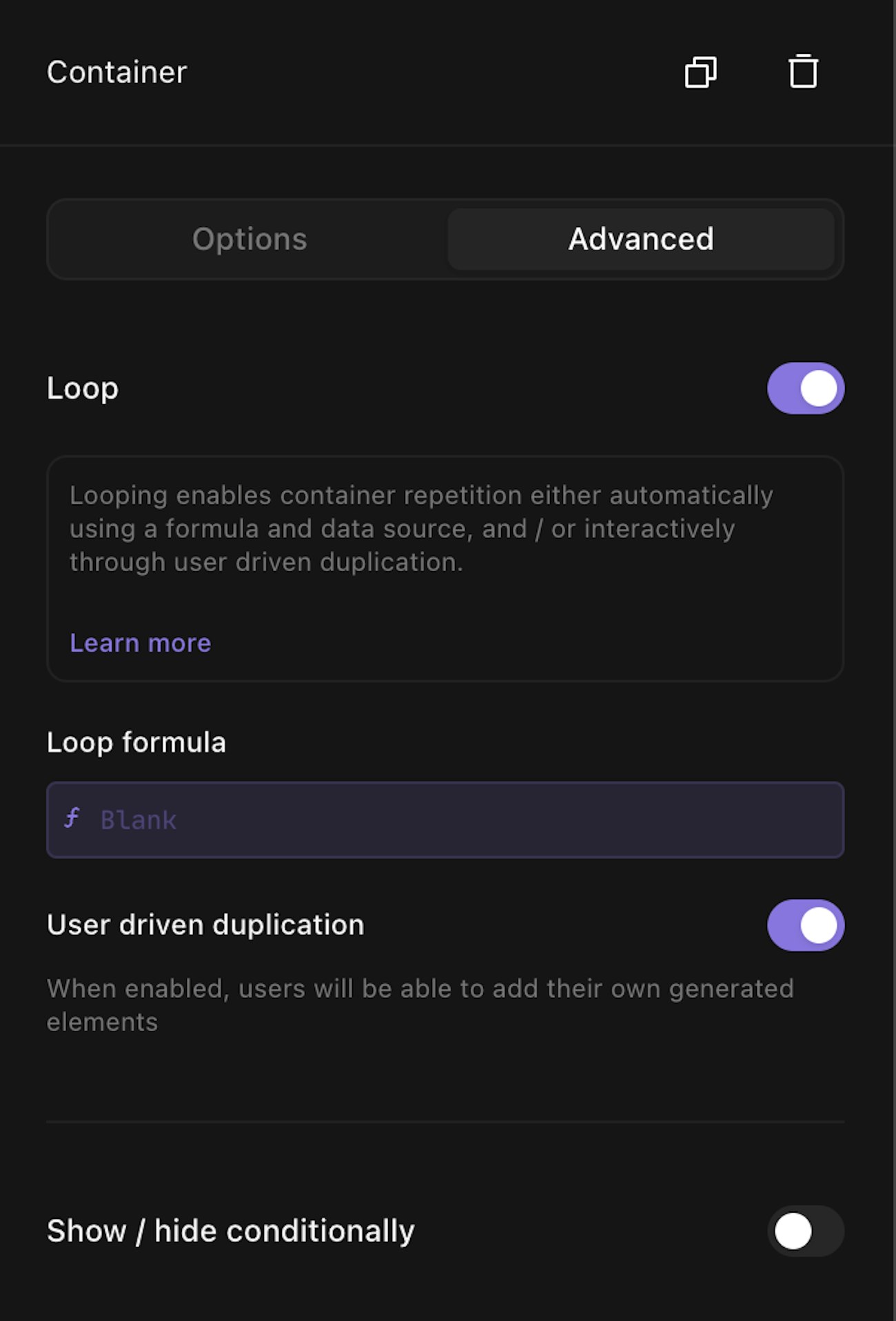 There is also an option to enable User driven duplication, which allows users to continue adding looped elements to a container.