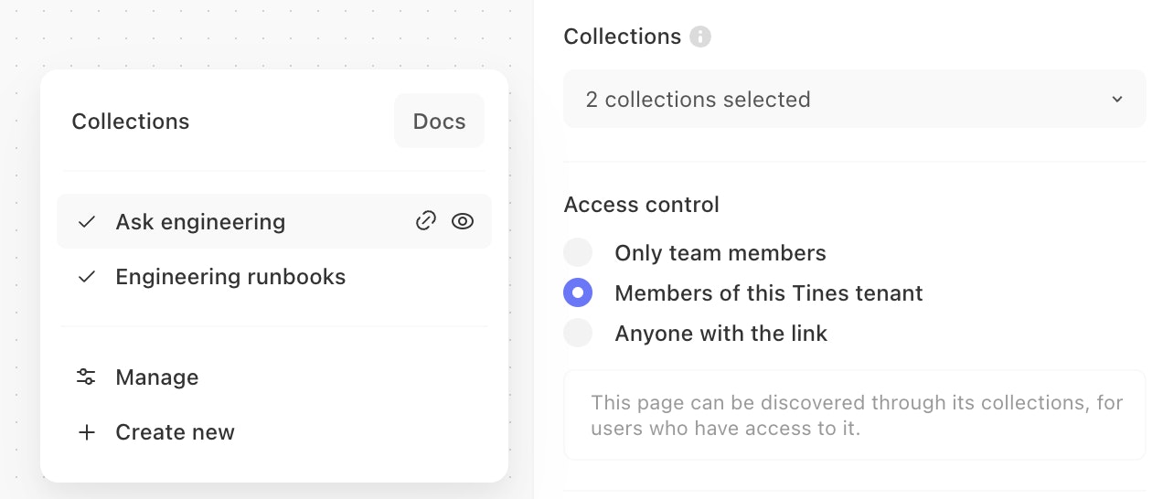 Your collection should have a unique name. It forms the URL so others can find it. For example, “Ask engineering” will be accessible at https://tenant.tines.com/collections/ask_engineering.