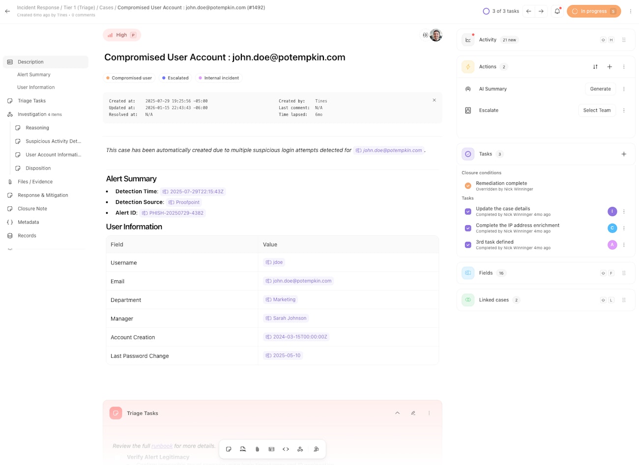 Whether you're running down a security incident, managing a support request, triaging a flood of alerts, or coordinating an operational task, cases can flex to your needs.