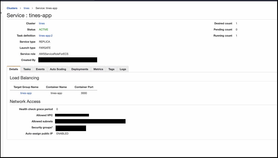 With the Tines deployment in Fargate, the Security Group is attached directly to the service.