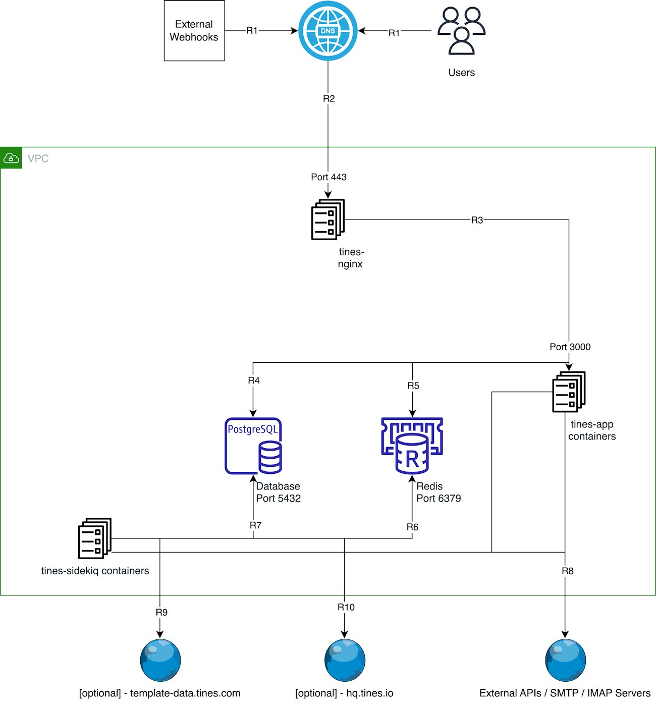 It features two core application containers: tines-app and tines-sidekiq. tines-app runs the Rails server for web application hosting/receiving webhooks. tines-sidekiq runs background worker processes. Both containers read and write to and from the PostgreSQL database and Redis cache - they don't communicate directly, instead, they swap data and messages through PostgreSQL/Redis.