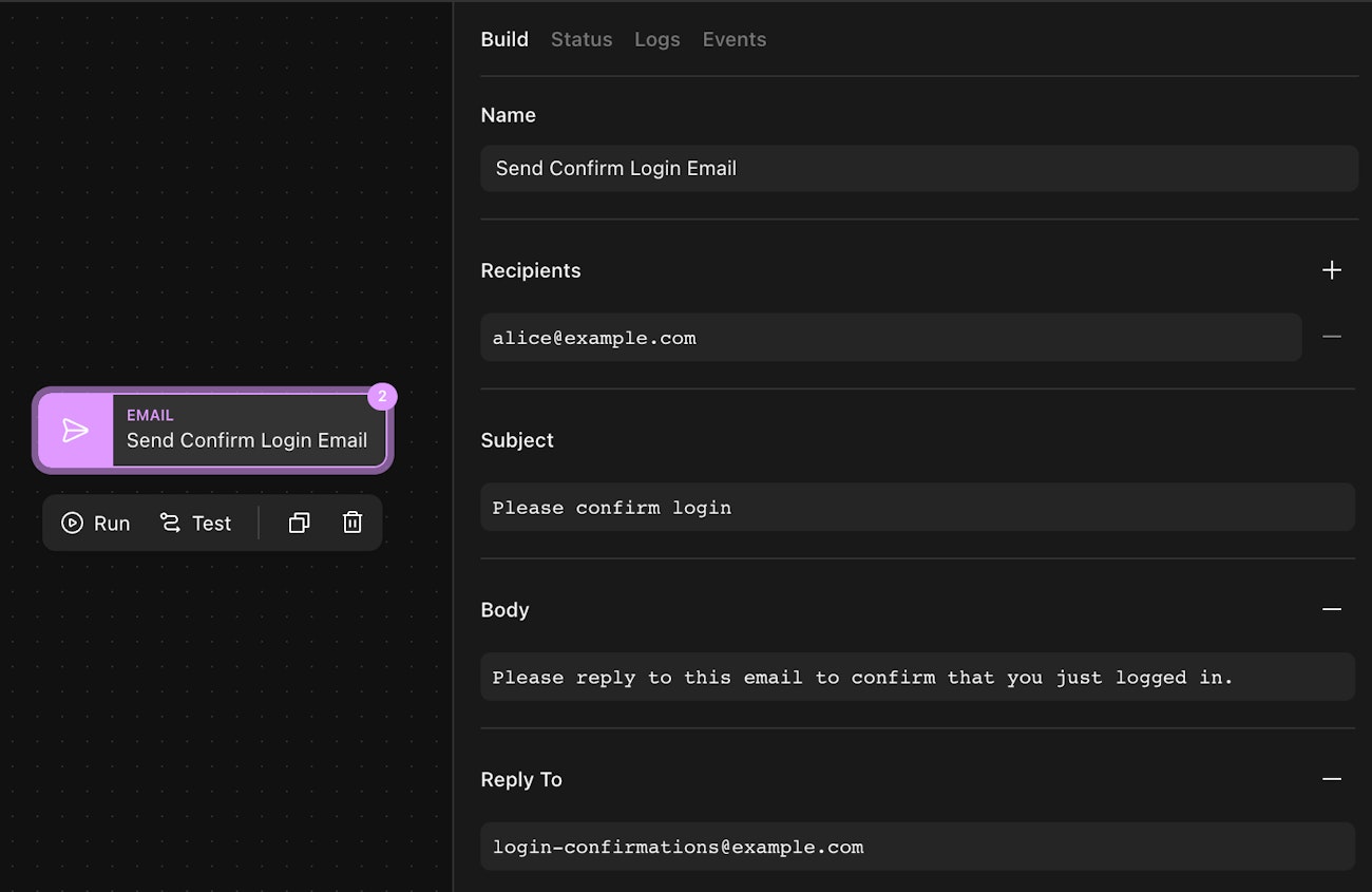 When you add an email action to the story, its options will now default to your email address: