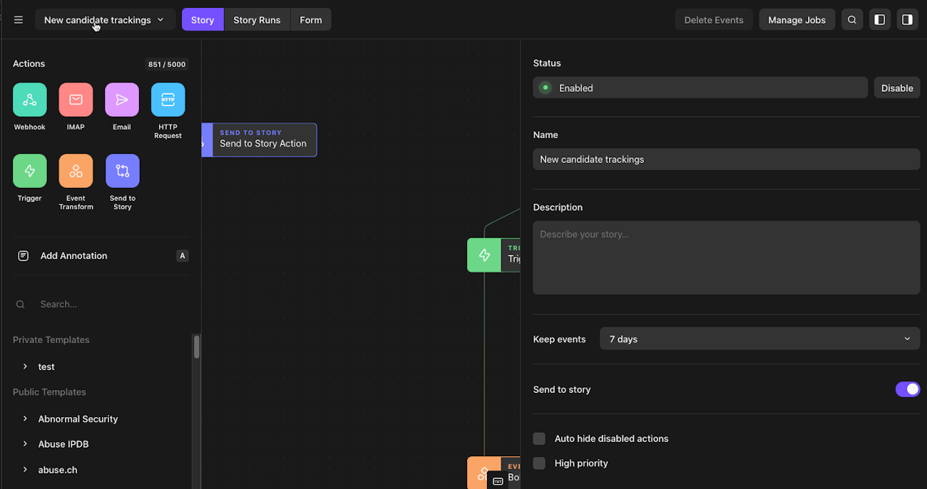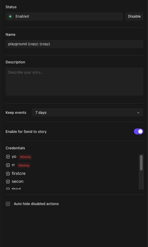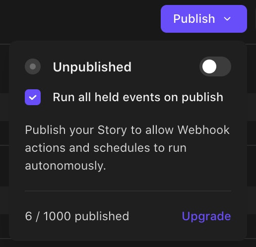Event holding for unpublished stories: Events emitted by an webhook action or a scheduled action in an unpublished story will be held until manually emitted. This will enable unpublished stories to be tested safely without inadvertently triggering other actions that are not yet ready for production.