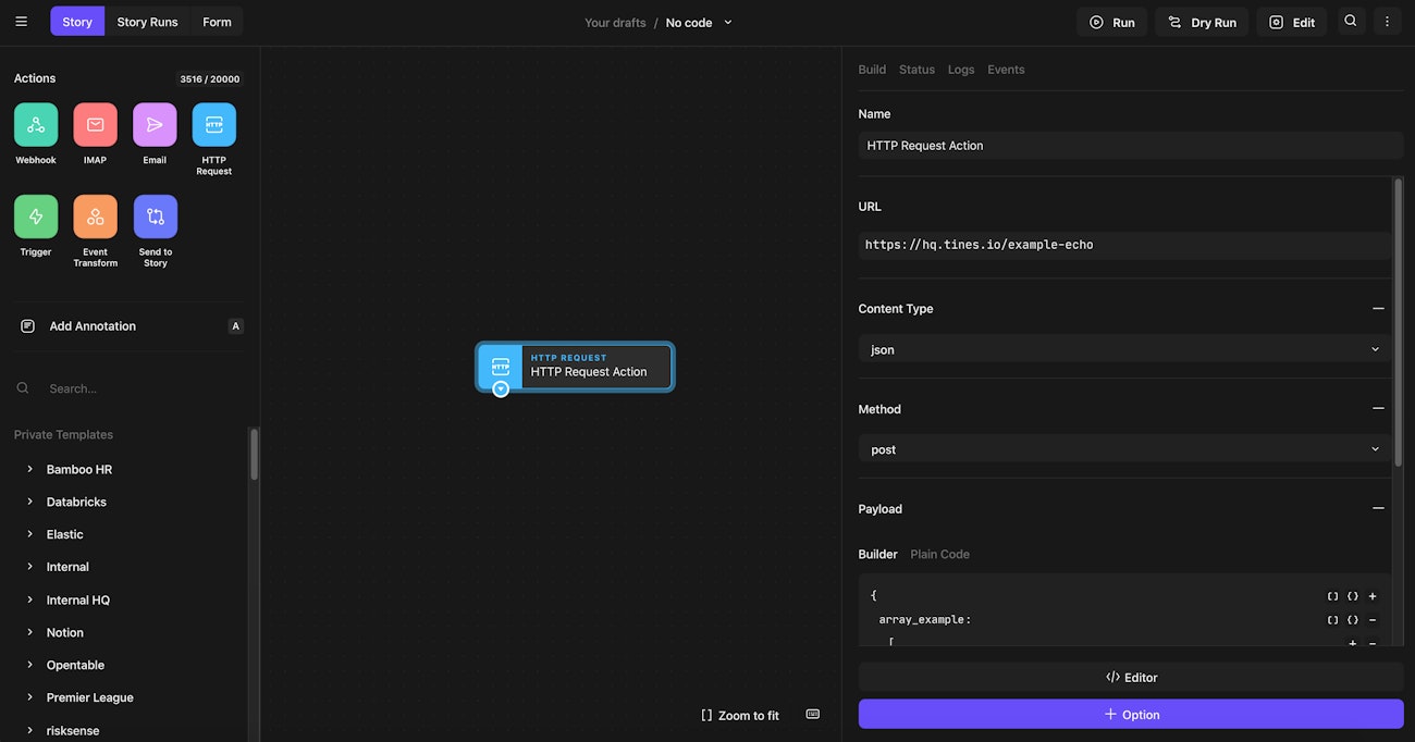 /example-echoendpoint on your Tines tenant. When the action sends a request to this endpoint, the response will show what data the request contained.Added API endpoints for:
