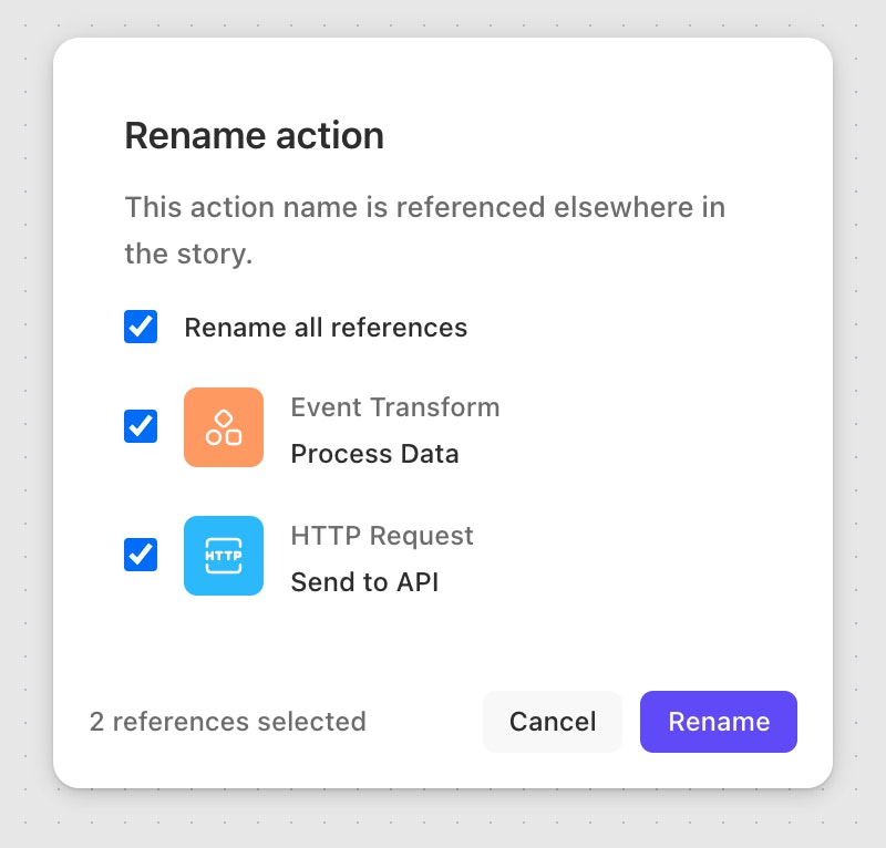 When you rename an action, you will be prompted to update references to that action in downstream actions: