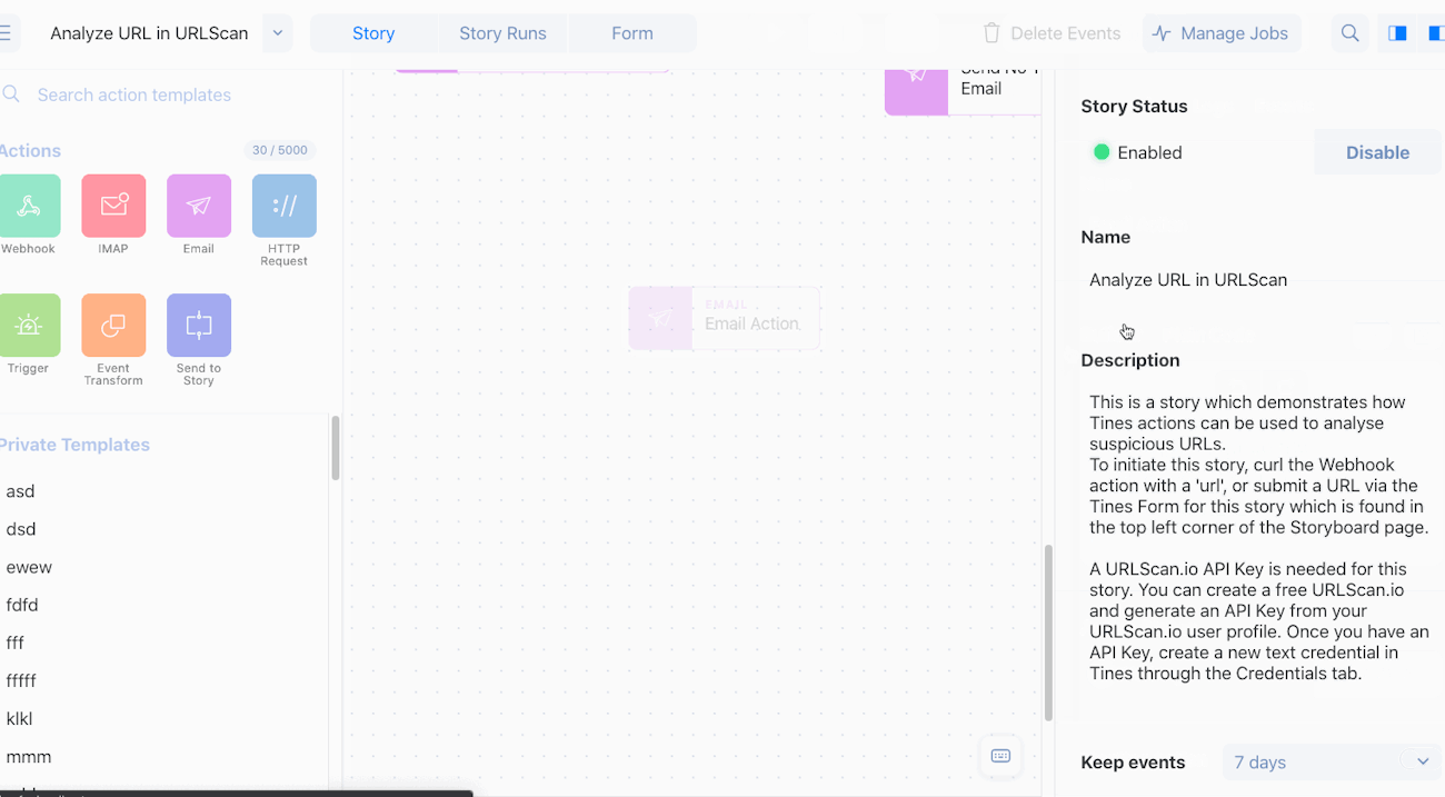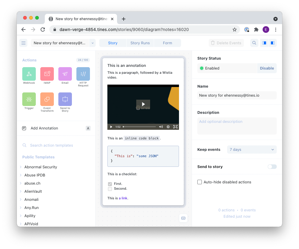 Now you can now paste in cURL commands to the storyboard and you'll get a Tines Action created immediately. This feature should make it much easier to use any documentation that features cURL and kickstart utilizing those API calls within Tines.