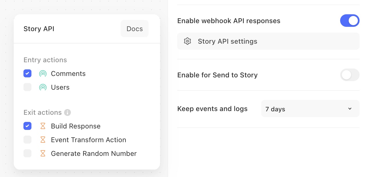 Using APIs it is possible to make a HTTP request to initiate a story run and receive event data back from the story. This can be configured via API settings:
