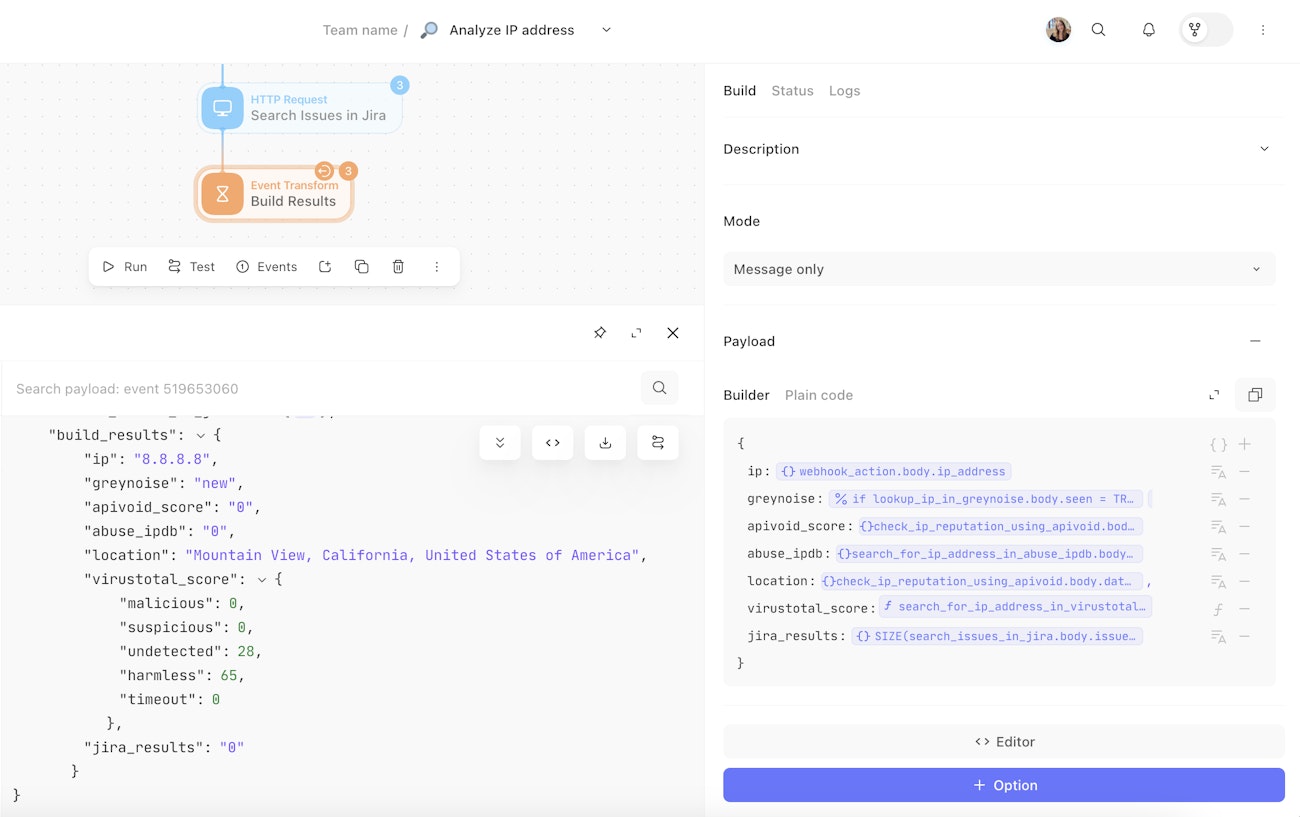 In the example, the sub-story Analyze IP Address has the following data defined in its output action.