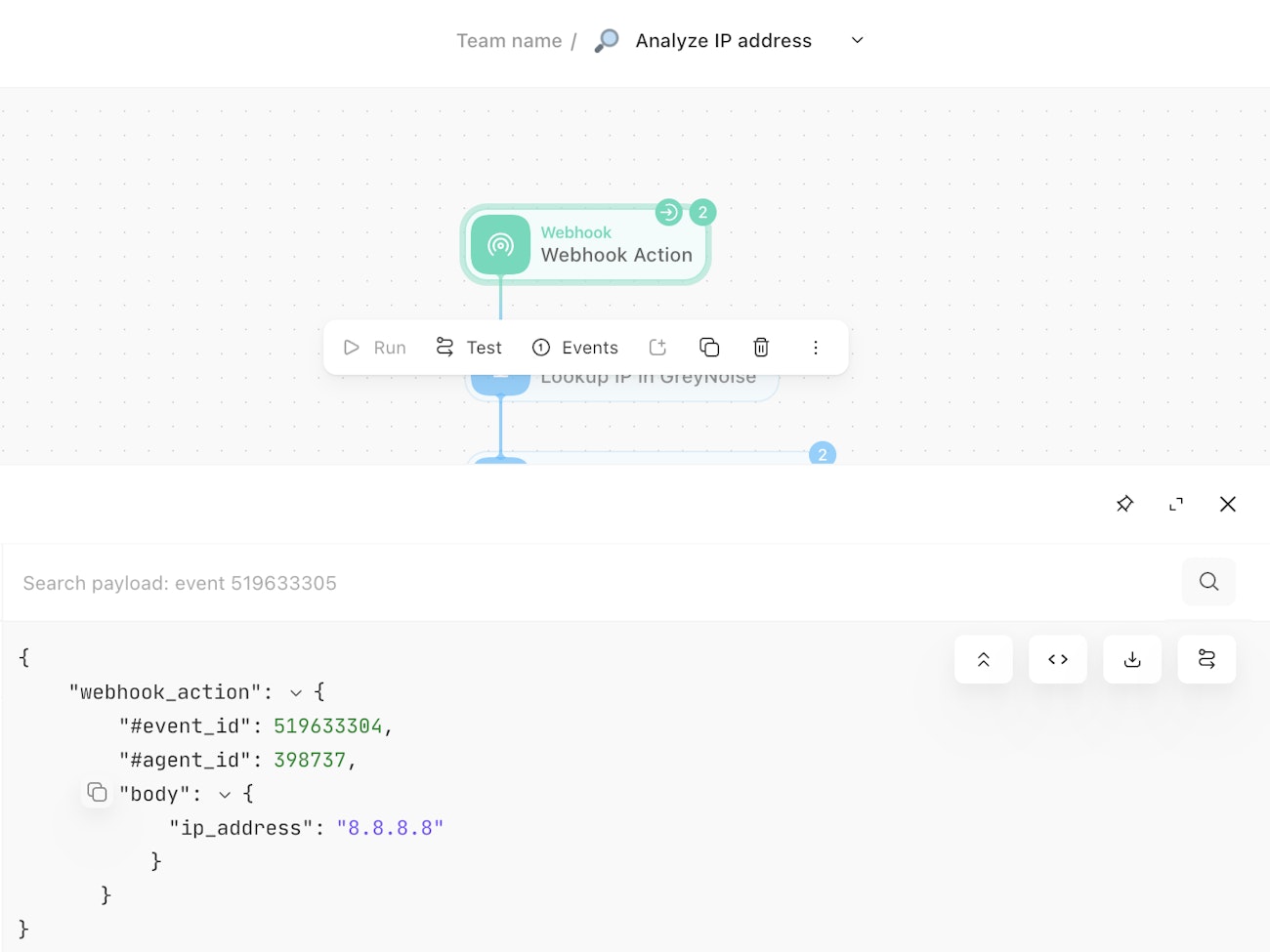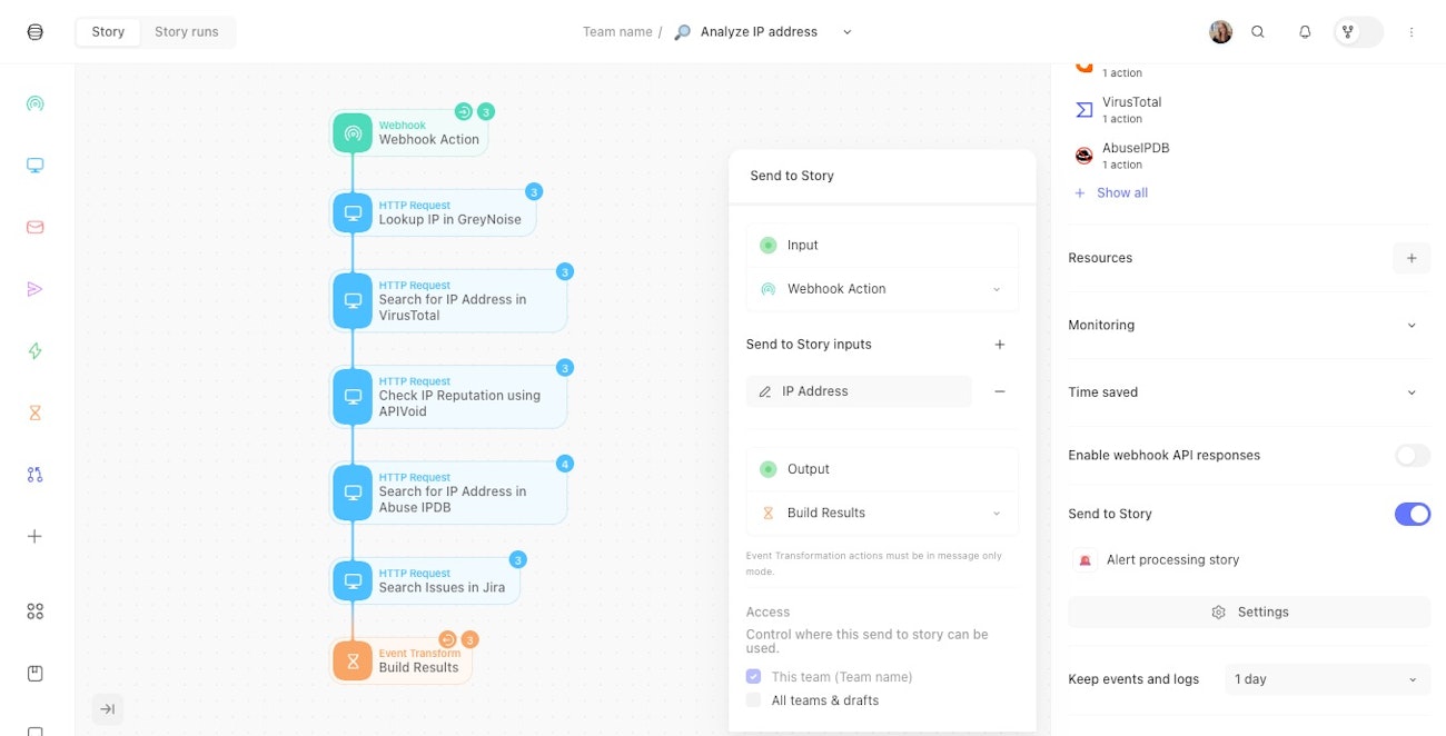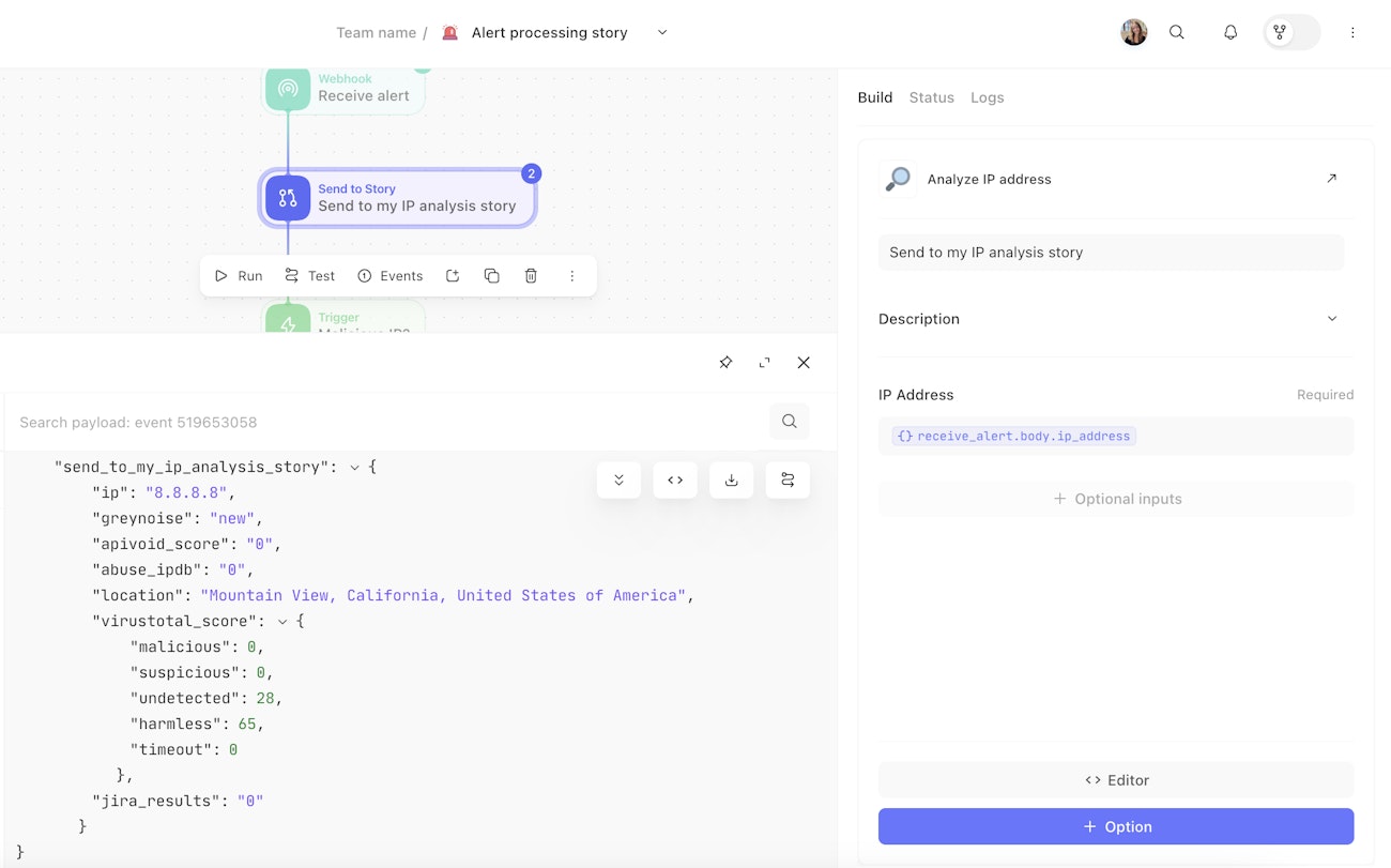 In the example, the sub-story Analyze IP Address has the following data defined in its output action.