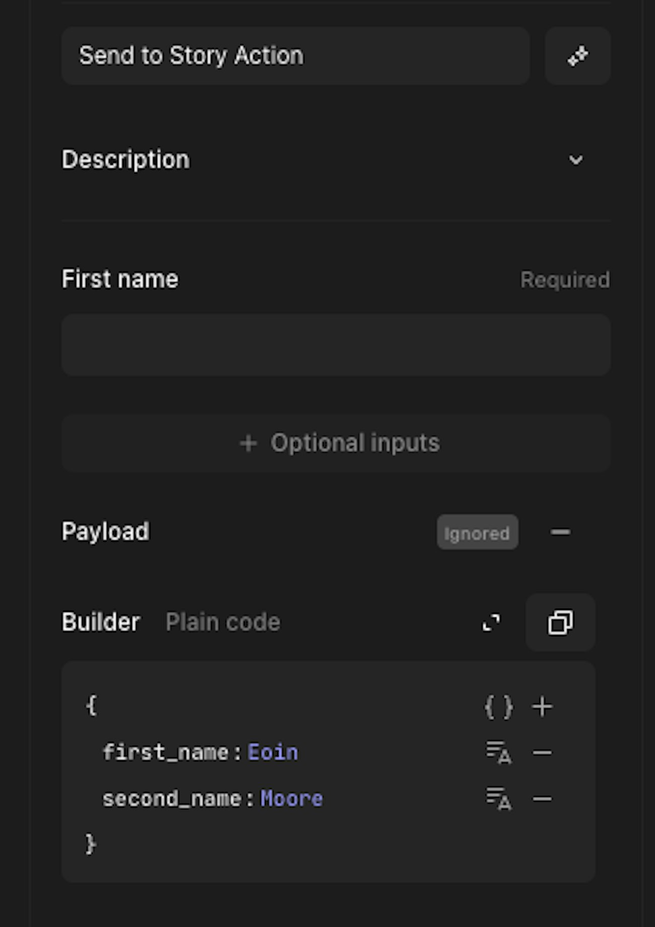 Inputs are the defined values your sub-story needs to run. These will be auto-populated in the send to story action when your sub-story is specified. These inputs can also be updated on the webhook action itself.