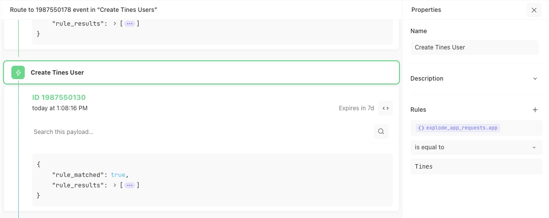 Events can take multiple routes during a single story run, usually as a result of "exploding" an array or branching to multiple actions in a story. When an individual action is selected in the routes pane, the actions that were part of that particular route will remain highlighted, making it easier to understand which actions took place to arrive at a particular event.