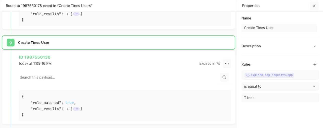 Events can take multiple routes during a single story run, usually as a result of "exploding" an array or branching to multiple actions in a story. When an individual action is selected in the routes pane, the actions that were part of that particular route will remain highlighted, making it easier to understand which actions took place to arrive at a particular event.
