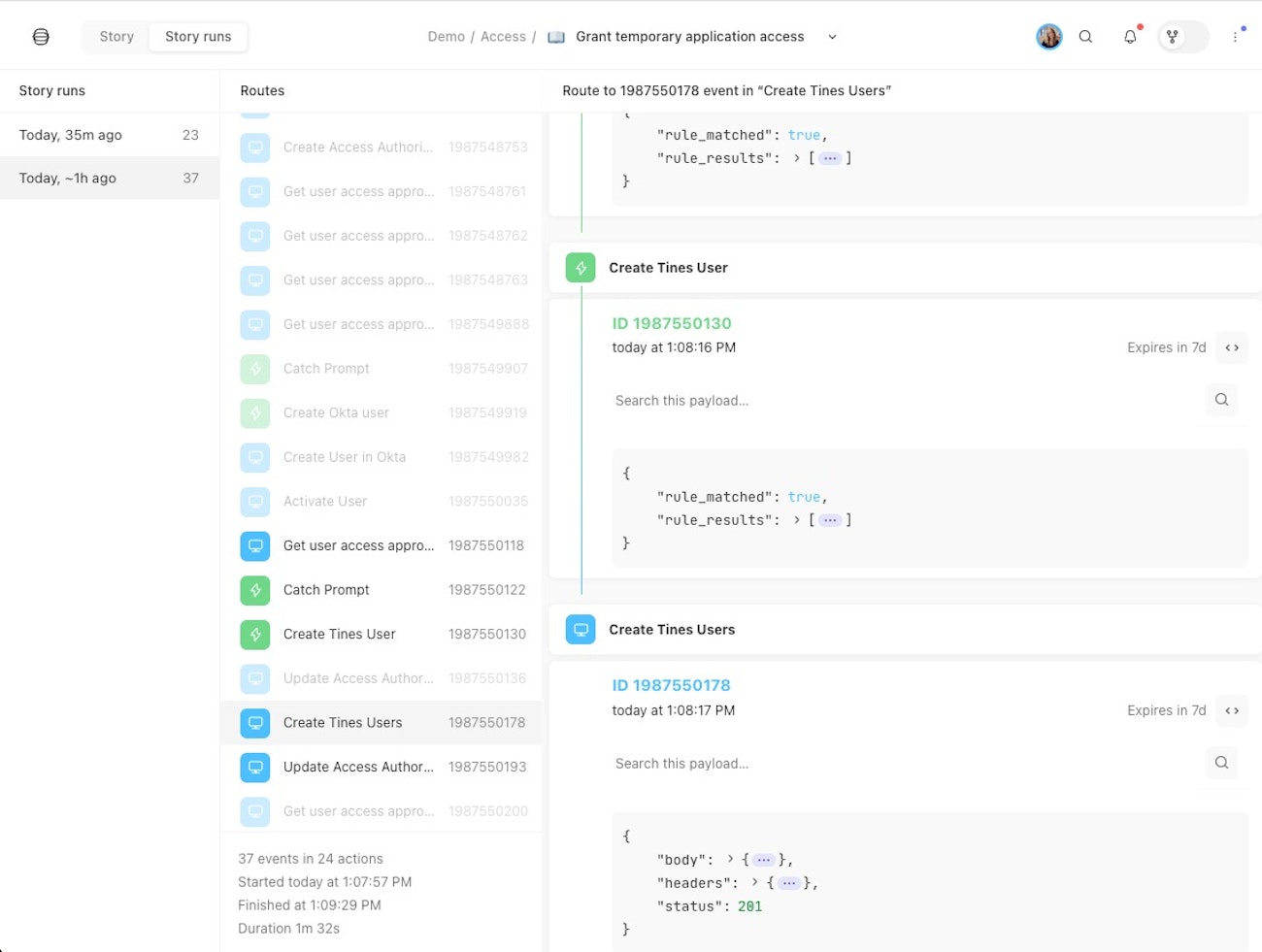 Within the events viewer, you can select the kebab menu and click 'Open story run' to open an event in the context of its story run. This allows you to more easily understand what happened before or after an event occurred.