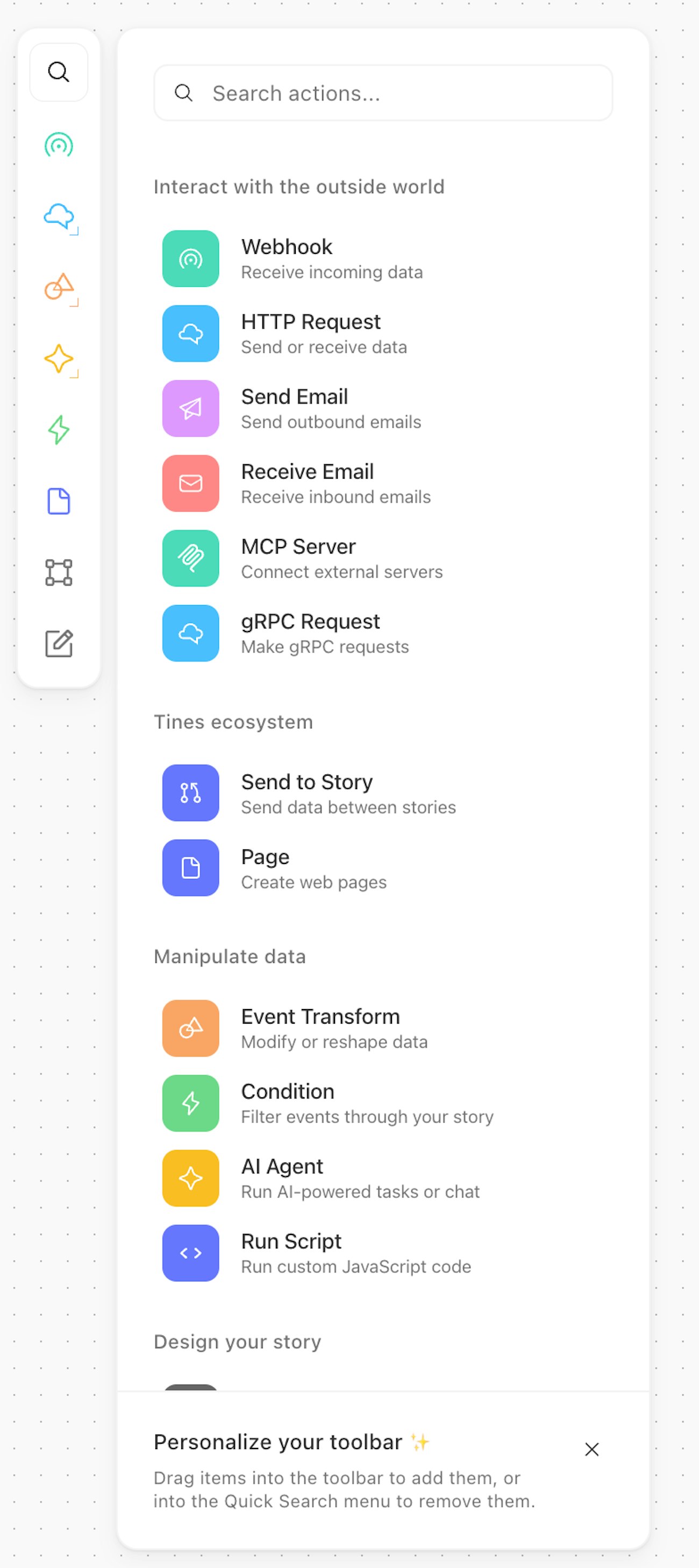The story toolbar is a floating toolbar with a consistent structure where all actions are surfaced naturally. By default you'll see the most used actions and you'll be able to modify it to your own preferences by drag and dropping a actions onto the toolbar. Each toolbar is customised per user per tenant.