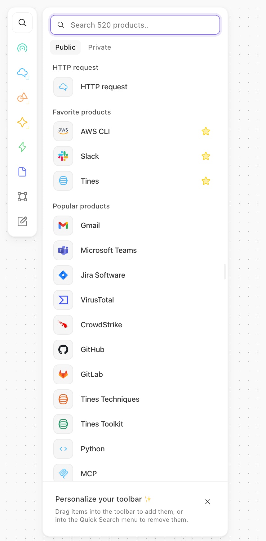 When inside of the quicksearch or templates popups, simply drag and drop the action into the toolbar.