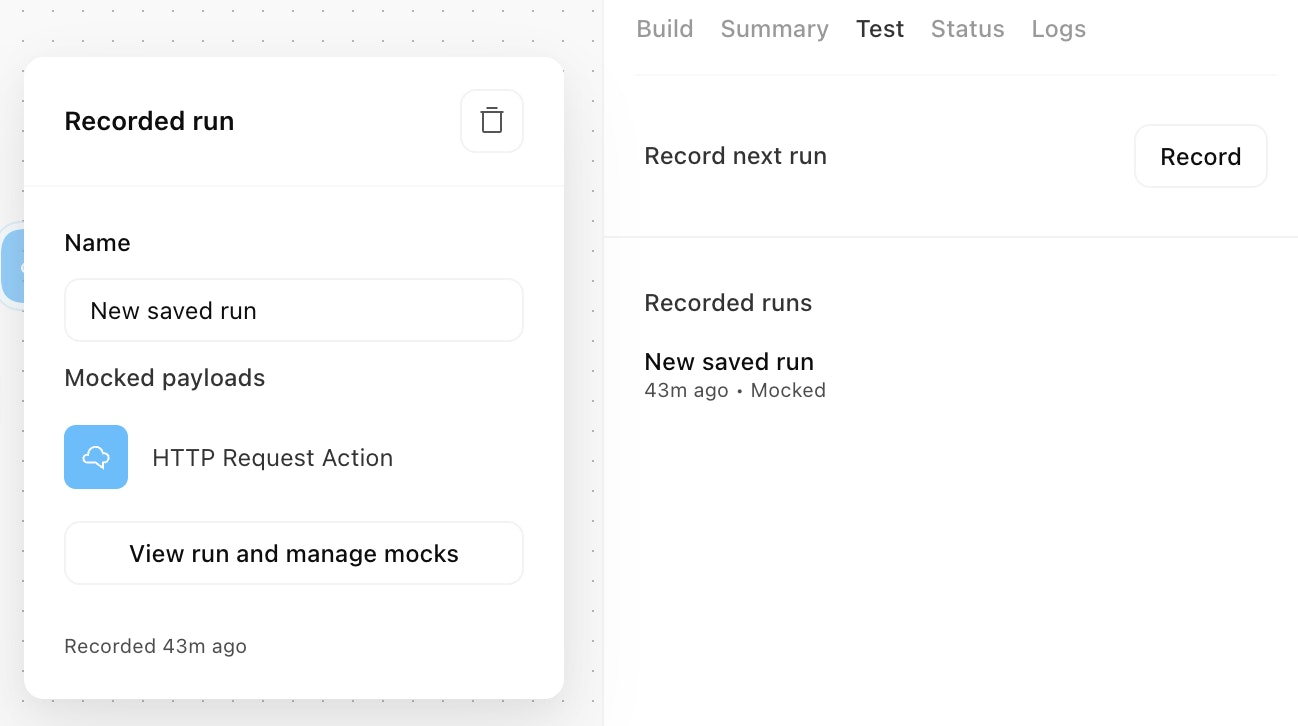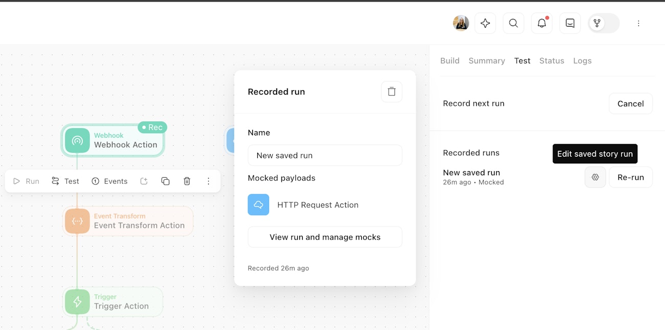 To save a story run, go to Test tab in the right hand side panel of your desired webhook action or receive email action, and select Record. Once set, the next input received by those actions and subsequent story run will be recorded and saved. Saved story run inputs are not restricted by the event retention period and will be available until you delete the saved run. There is a limit of 20 saved story run inputs per action.