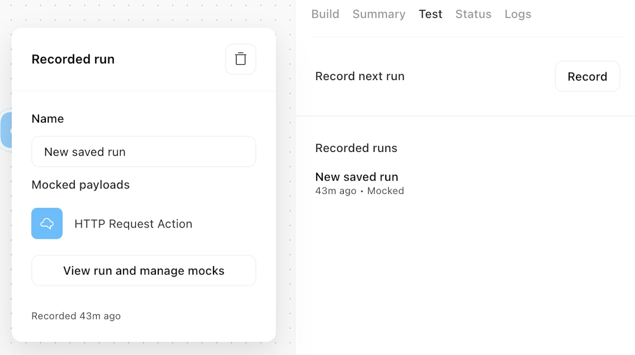 To save a story run, go to Test tab in the right hand side panel of your desired webhook action or receive email action, and select Record. Once set, the next input received by those actions and subsequent story run will be recorded and saved. Saved story run inputs are not restricted by the event retention period and will be available until you delete the saved run. There is a limit of 20 saved story run inputs per action.