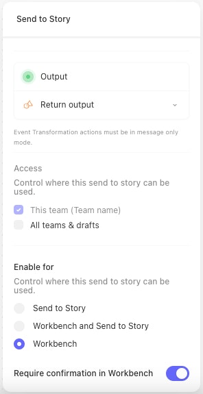 Enable for Workbenchis toggled on, the story can only be called via Workbench and cannot run autonomously (i.e. scheduled actions will not run and the webhook will not accept events from outside of Workbench). The story will not count towards any license counts.