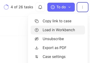 To send a case to Workbench, select the kebab menu on the top right of the case and select Load in Workbench. This will open a new chat with Workbench with the embedded context of your case. Updates to the case will be sync'd with the chat in real time.