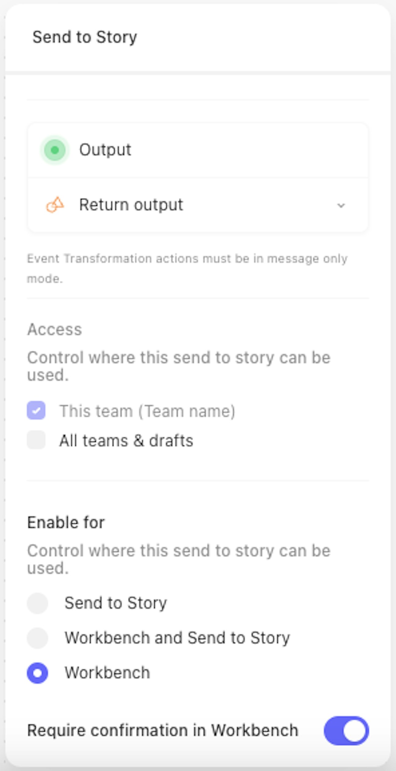 Enable for Workbenchis toggled on, the story can only be called via Workbench and cannot run autonomously (i.e. scheduled actions will not run and the webhook will not accept events from outside of Workbench). The story will not count towards any license counts.