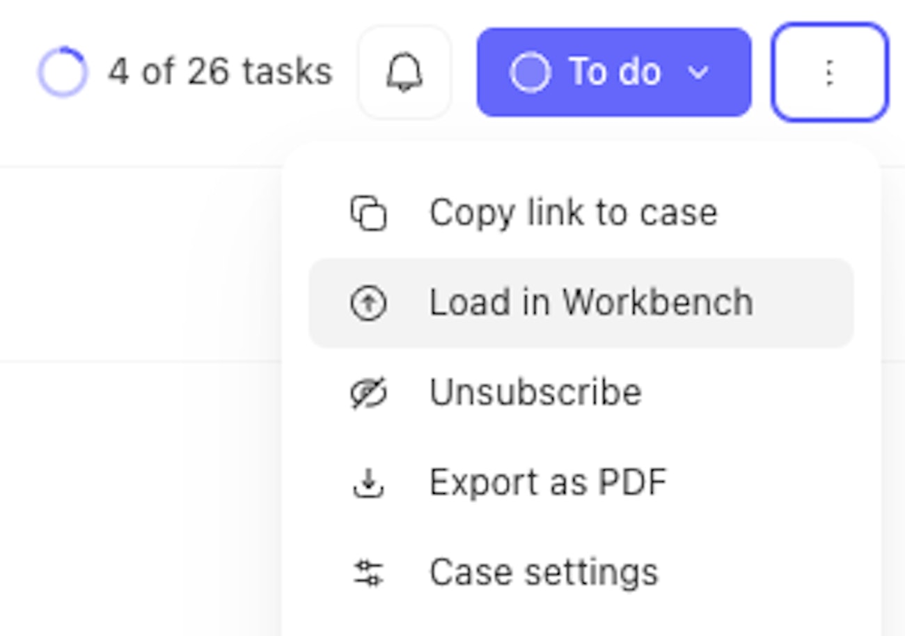 To send a case to Workbench, select the kebab menu on the top right of the case and select Load in Workbench. This will open a new chat with Workbench with the embedded context of your case. Updates to the case will be sync'd with the chat in real time.