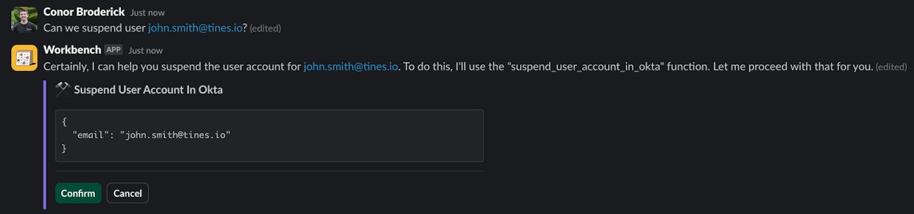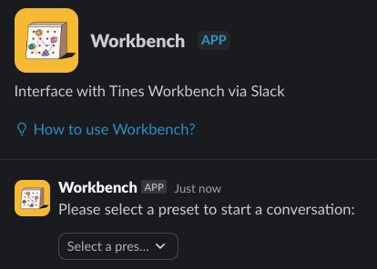Workbench in Slack brings the power of AI in Tines directly into your team’s Slack workspace, allowing you to take action and access proprietary data in real-time—all within Slack. With Workbench's secure, private AI capabilities, you can run tools configured in Tines, automate workflows, and get intelligent responses without switching contexts. Conversations started via Slack are also accessible within your Tines tenant.