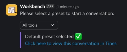 All toolspreset.Selecting a preset applies it to the current conversation and provides a link to view the conversation in Tines.
