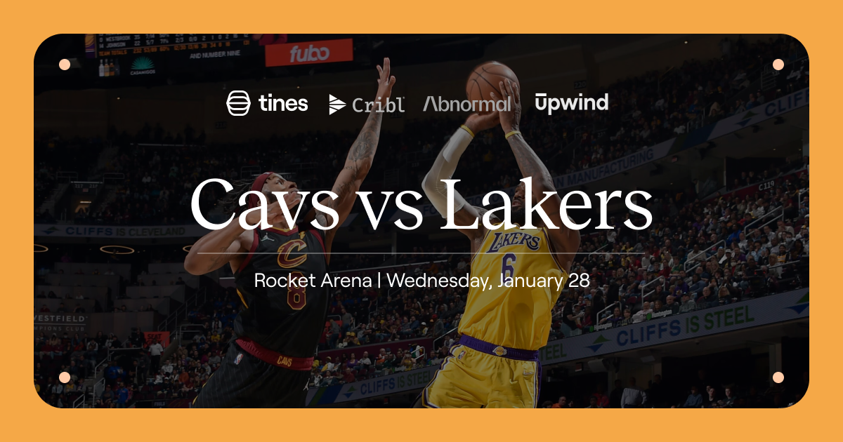 Join Tines, Cribl, Upwind, and Abnormal Security for an exclusive experience as the Cleveland Cavaliers take on the Los Angeles Lakers on January 28. Guests will enjoy the game from a private suite, offering a premium setting to connect with fellow security professionals while experiencing one of the NBA’s most anticipated matchups.
