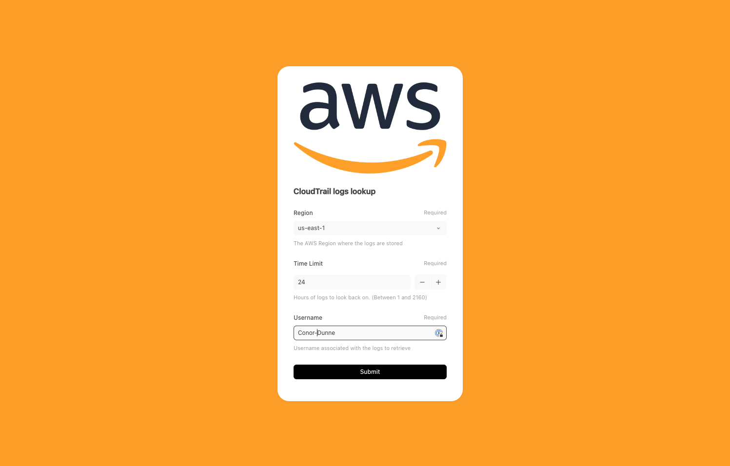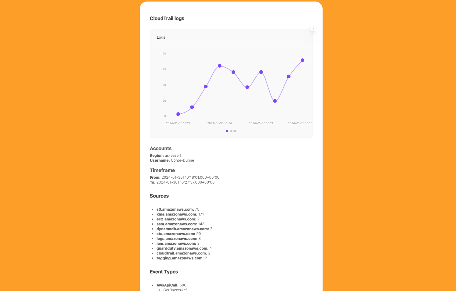 Search AWS CloudTrail for logs associated with a user identity. Return usage statistics on the account including: AWS Service Sources, Access Types with used functions, Resources the account interacted with, and Source IP Addresses for the activity.